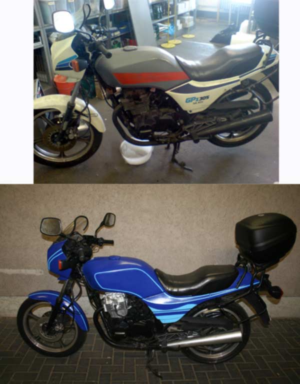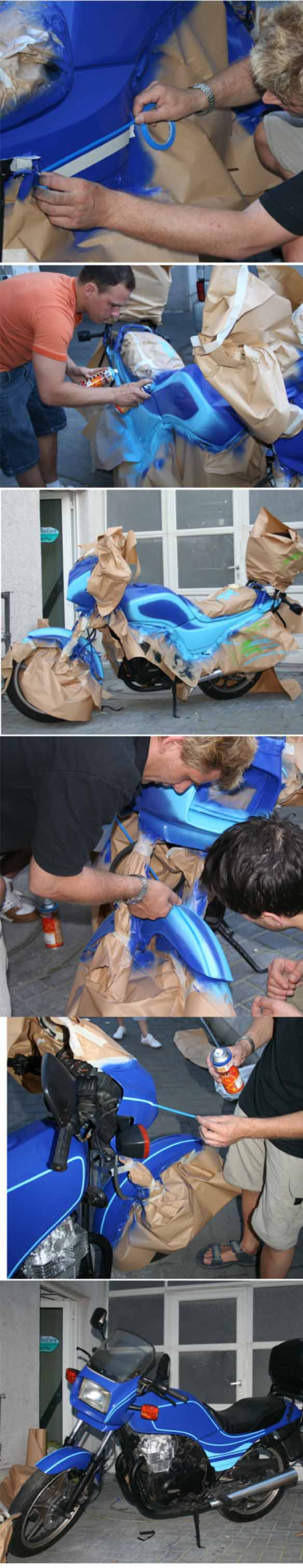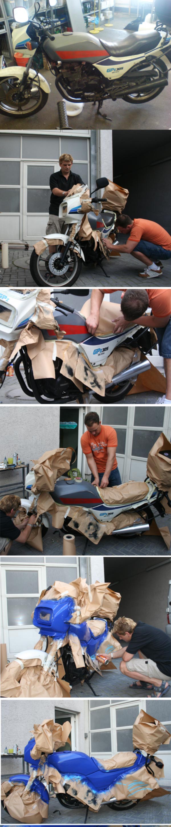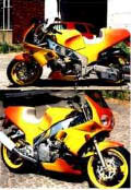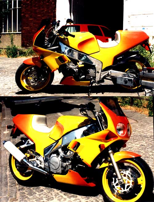 Teil 2 .....nach diversem Abkleben und Lackieren....war es vollbracht. Das Motorrad erstrahlte im neuen Glanz, bereit für die Crashaufnahmen um danach wieder auf dem Schrott zu landen. |